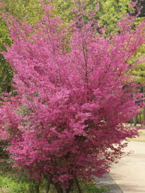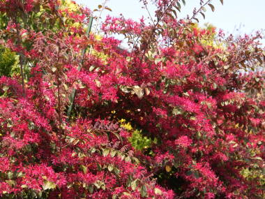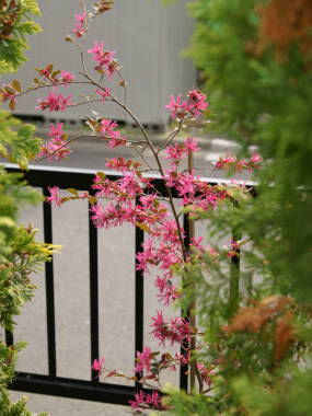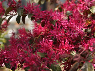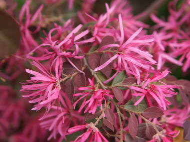 | トキワマンサクは3月から5月頃に花を咲かせる花木です。白花なのですが、変種で中国南部に分布しているベニバナトキワマンサクという赤花から桃花の花を咲かせる種類がよく出回っています。また春ほど沢山は咲きませんが秋にも開花します。葉の色はトキワマンサクは青葉ですが、ベニバナトキワマンサクは青葉と赤葉があり、耐寒温度は−5度ぐらいで、暖地では庭植え、生け垣にも利用されています。暖地では常緑なのですが、やや寒い地域になると少し葉が落ちて半常緑気味になるようです。−5度を超えるような寒地では鉢植えにして室内で越冬させた方がよいようです。病気や害虫には強い方で、生け垣にも向いています。花が満開になると赤や桃色に染まりとても美しいです。 |