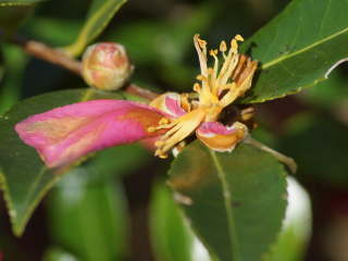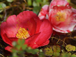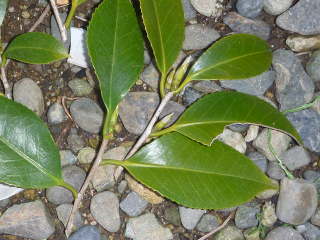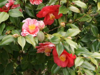 | ツバキの仲間は日本や中国などに200種類以上の原種があるそうです。ツバキと呼ばれるのは日本のヤブツバキやユキツバキなどの他、それを母体に同じ仲間と交配された園芸品種です。山で見かける赤い花のヤブツバキは早ければ11月頃から咲き始め、1月下旬頃から3月にかけて沢山咲くようになります。園芸品種は1000種類以上があり、日向から半日陰でもよく育ち昔から庭木としてよく植えられています。 |
