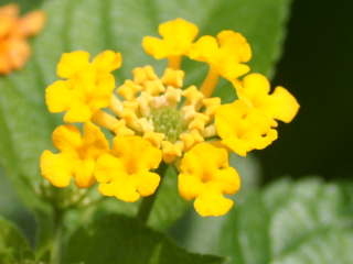 | ランタナは150種類ほどがあるそうです。お店によく出回っているのはこのページで紹介しているカマラやコバノランタナ、またそれらの園芸品種です。コバノランタナは葉が小型で横へ広がる匍匐性で、こちらで紹介しているカマラは木立ち性です。七変化という別名でも呼ばれ、花が咲いて日にちが経つとだんだん花色が変わってきます。全ての種類の花色が変わるわけではなく、白や黄色の単色をした種類で変わらないのもあります。花期がとても長く、初夏から秋まで次々と花を咲かせ続けます。熱帯の植物なので寒さにやや弱いですが、それを除けば強健で暖地では庭植えもできます。 |
