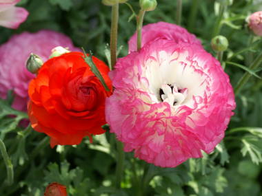 | ラナンキュラスはアネモネと同じく、3月から4月頃に花を咲かせる球根植物です。秋植え球根なのですが、温室で育った開花株が早春頃から売られている事もあります。花色は単色の黄色、赤、桃色、白などの他、花色が混じったものもあります。花の形は一重咲き〜八重咲きがあり、品種はビクトリアストレイン、ルネッサンス、ドリーマなど沢山あります。元々は今のように豪華な花の姿をしていなかったようで、シンプルで小さな花が品種改良によって今の姿になったそうです。 |