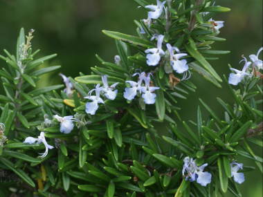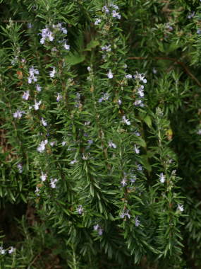 | ローズマリーはハーブとしてよく知られています。花は冬から春に多く咲きますが、年間を通じて不定期に花を咲かせます。葉を肉料理の風味づけに利用されたり、ハーブティー、ポプリなどにも利用されています。よく聞く有名なハーブなので、どんな花なのだろうかと興味半分で購入した事があり、プランターに植えていた事がありますが、やや夏の高温多湿を嫌い下葉が枯れやすいですが、育てるのは特に難しい事はありませんでした。種類は立ち性、半木立性、匍匐性の種類があり、花色は紫色が一般的ですが、白花や桃花もあります。これとよく似たウエストリンギアというのもあり、よく似ているのでオーストラリア・ローズマリーという別名もあります。 |