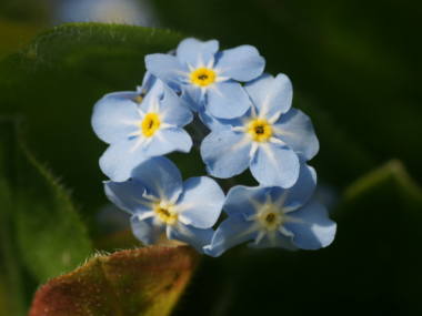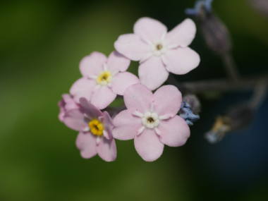 | ワスレナグサは3月下旬から5月頃、次から次へと花を咲かせ続ける一年草の草花です。花は0.6cmぐらいの小い花が集まって花序を作ります。花色は青、桃色、白があり、草丈は30cmぐらいの低いタイプが多いですが、50cmぐらいになる高性タイプもあって切り花として利用することもできます。花の名前の由来は、ドナウ川で恋人のためにこの花を摘んでいて、川に誤って落ちてしまい「私を忘れないで」と叫びながら溺れて死んでしまった。と言うことで名付けられたそうです。 |