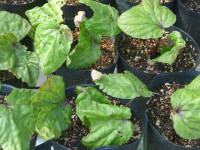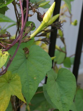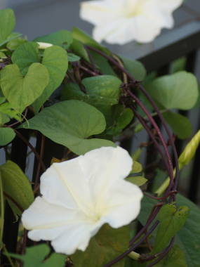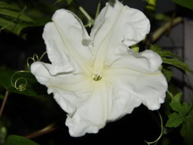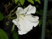 | ヨルガオは朝顔と同じヒルガオ科のつる性植物で夜開性になります。夏は日が暮れてから朝にかけて開花、秋になって涼しくなると夕方から朝にかけて開花します。花は15cmぐらいと大きく芳香性がありとてもよい香りがします。葉は丸っこい丸葉アサガオのような葉をしているのが一般的ですが、普通の朝顔のように尖った葉をつける事もあります。育てるのはアサガオとあまり変わりはなく、違いは種が大きいので表面を少しヤスリで傷を入れて種まきをした方がよい事、普通の朝顔に比べると蔓が太く大きくなるので株間は広めに、鉢植えの場合は大きめの鉢植えがよいです。蔓性でよく伸びるので、緑のカーテンの素材にも利用されます。ユウガオという名前で販売されている事が多いですが、本来のユウガオはウリ科で大きな実が成る別の種類の植物です。 |