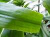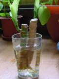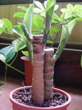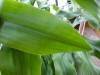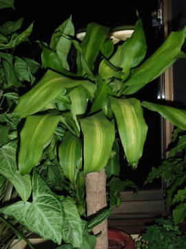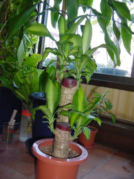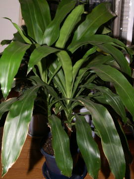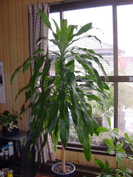 ドラセナ・フラグランス(Dracaena fragrans)斑のない種類です。写真のドラセナ・フラグランスは1992年頃に、斑入りのマッサンゲアーナの一部を挿し木して大きくしたものです。挿し木は遊び半分で行なったので、長さ5cmぐらいととても小さなものでした。斑入りのマッサンゲアーナを挿したのですが、その後に班が消えてしまい、原種のフラグランスに種戻りしてしまったようです。2004年の1月頃、寒さ対策をせずにサンルームへ置いていたため、凍傷で上部が全て枯れてなくなりましたが、株元から新しい芽が出て、樹形が異なる形で復活しました。ドラセナ・フラグランス・マッサンゲアーナ(Dracaena fragrans ’Massangeana’)斑入りで葉の緑色と中央の縞模様のコントラストがとても美しい観葉植物で、幸福の木の中では一番人気のある種類で、お祝いにもよく送られています。写真のはサンルーム内で凍傷にあい枯れてしまいましたが、育てるのはそう難しくはありません。 |
