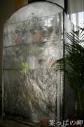 ビニール温室に直射日光が当たって中の温度が上がると、ビニールに水滴が付着して床まで流れ落ちる事があります。床を腐らせないよう、水を通さないシートを床に敷いておくとよいです。水滴が付いてしまった場合は、室内が暖かい時に開けて、着いた水滴を自然に蒸発させるとよいです。冬の空気はよく乾燥しているので、意外とよく乾きます。部屋の暖かい時間帯は開けておき、暖房を切る時には閉めるというのが寒暖の差が少なくなるのでよい方法だと思います。それと、葉がビニールに触れるとその部分が枯れる事があるので、葉が触れないように鉢を置いた方がよいです。