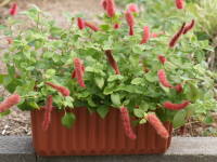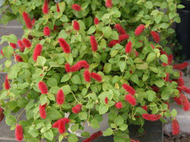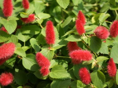 | アカリファは真っ赤な猫じゃらし(えのころぐさ)のようなかわいらしい花を咲かせます。真夏は一時花の開花が鈍くなりますが、暖かい時期はずっと花を咲かせ続けます。キャッツテールの意味は猫の尻尾のようなのでそう呼ぶそうです。同じ仲間でベニヒモノキという種類もあります。 |