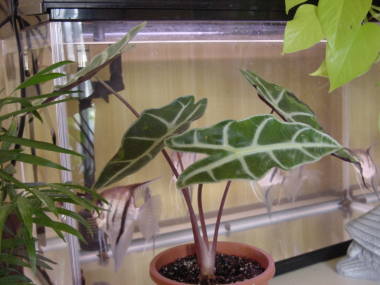 | 70種ぐらいあるアロカシア属の仲間で、茎が芋のようになるのが特徴です。アマゾニカは熱帯植物らしいエキゾチックな個性のある葉をしており、この仲間の中では寒さに弱い方です。鉢植えで売られているものは葉の長さが20cmぐらいですが、写真の植物園にあった大きなアマゾニカは、葉の長さが50cmぐらいありました。水槽の前にあるものは秋が深まった頃に水を与え過ぎ、根腐れさせて枯らせたものです。比較的水を好むので気温の高い時期に水切れしないように与えていましたが、秋になって気温が下がって水をあまり吸わなくなったにも関わらず、普通の感覚で水やりしてしまい失敗とよくある話です。寒さに弱いので、冬を越させるのが難しく、他に園芸品種で葉が小さいバンビーノ、葉脈が多いグリーンベルベッド、葉が丸っこい形をしたブラックベルベットなどもあります。 | ||||||||||||||||||||||||||||||||||||||||||||||||||||||||||||||||||||||||||||||||||||||||||||||||||||||||||||||||||||||||||||||||||||||||||||||||||||||||||||||||||||||||||||||||||||||||||||||||||||||||||||||||||||||||||||||||||||||||||||||||||||||||||||||||||||||||||