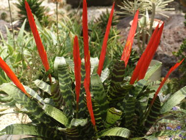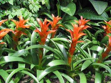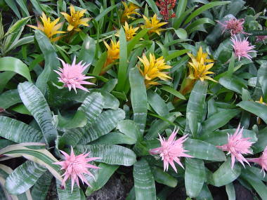 | アナナスの仲間は多く、赤や黄色の美しい花のようみ見える苞をつけるもの、葉の美しいもの、実の成る食用のパイナップルも同じ仲間になります。日本ではパイナップル科の事を全て、アナナスと呼ばれています。種類はエクメア属、クリプタンサス属、グズマニア属、チランドシア属、ニズラニューム属、ネオレゲリア属、フリーセア属などがあり、大型のものから小型のもの、小型の多くは木に着生しています。多くは筒状の葉があって水が貯められるようになっていて花が咲きます。花の観賞期間は数カ月ととても長く、開花時期は種類によって異なり、冬に咲くインコアナナスは普通の部屋の暖かさと明るさがあれば咲きます。 |