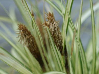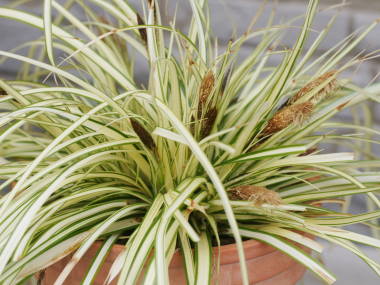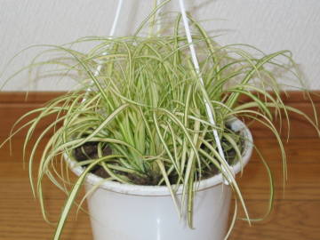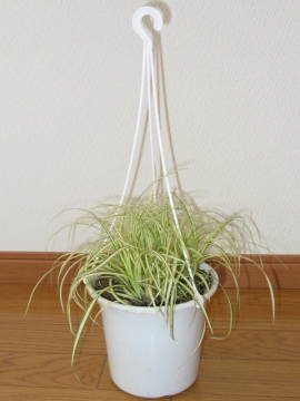 | 白い斑の入った葉模様で、細い葉を沢山茂らせたやさしい感じの観葉植物です。耐寒性には強く氷点下にも耐えられるので、年間を通じて戸外で育てる事もできます。カラーリーフとして花や観葉植物との寄せ植えにも向いており、葉が細く垂れるので吊り鉢にして売られている事があります。春に茶色い動物の尻尾みたいな花が咲く事があり、見ようによっては面白い花なのかもしれません。 | |