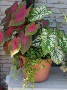 カラジューム学名:Caladium別名:カラジウム 科・属名:サトイモ科・カラジューム属 原産地:熱帯アメリカ 分類:球根植物 寒さ:弱い(10度以上) 暑さ:強い 日照:日向(夏は半日蔭) 耐陰性:あり 花言葉:喜び 用途:鉢植え、寄せ植え |