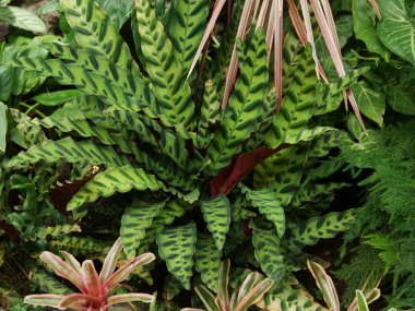| カラテアは熱帯植物らしい葉模様が美しくエキゾチックな姿をした観葉植物で、熱帯アメリカを中心に150種類ぐらいが分布しています。葉が地から伸びる根出葉と呼ばれるもので葉模様は美しく、葉の形はたまご型をしたものが多いですが、細く尖ったものもあります。葉裏が赤っぽくなって緑とのコントラストが美しく、よく見かけるマコヤナは葉裏にも模様があり、マシューには模様がなく葉裏が赤紫一色になっています。小型の観葉植物として育てられる事が多いですが、写真のセブリナとマコヤナは植物園にあったもので葉の長さが50cm以上ある大きなものでした。美しい花を咲かせるものもあります。 | ||||||||||||||||||||||||||||||||||||||||||||||||||||||||||||||||||||||||||||||||||||||||||||||||||||||||||||||||||||||||||||||||||||||||||||||||||||||||||||||||||||||||||||||||||||||||||||||||||||||||||||||||||||||||||||||||||||||||||||||||||||||||||||||||||||||||||