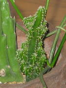 | 電磁波が吸収されてパソコンやテレビの前などに置いておくと目の疲れや頭痛に効果があると言われ売られている事があります。実際の効果は不明で、外国からこの事が伝わって売られるようになったようです。コンパクトな樹形が面白い柱サボテンの仲間で、トゲは柔らかく毛のようで触っても痛くありません。育て方は普通のサボテンと同じですが、凍りそうな寒さに当たると葉が赤くなってしまうので、暖かい所で冬を越させた方がよいと思います。別名にセレウス・ペルヴィアヌス、セレウス・ペルービアナスとありますが、学名がよく分からず、Cereus