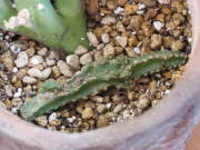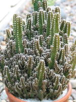 水やりいつも土が湿ったような過湿だと根腐れするので注意が必要です。春から秋の生育期は月に2、3回たっぷりと与え、11月から3月中旬頃までは月に1回ぐらいの水やりで、ほとんど与えない方がよいです。4月から徐々に成長してきますので水やりを開始します。植え替え2年に1回ぐらいは植え替えをします。鉢から抜いたら古い根などを取り除き、1週間ぐらい明るい日陰で乾かして植え付けます。行う時期は4月から5月頃が理想的です。用土は多湿を嫌い根が弱いので多肉植物専用の培養土が売られているので、それを使用した方が安全だと思います。サボテンの仲間ですが鋭いトゲはなく毛のように細いので、触っても刺さる心配はありません。増やし方(挿し木)柱に子株が沢山発生します。子株を取って根元が完全に乾くまで日陰で数日間から1週間ぐらい乾かし、多肉植物の培養土や川砂のような水はけのよい土の上に乗せるように軽く挿します。時期は4月から5月頃が理想的です。写真は秋の10月中旬頃に多肉植物の用土を使って行ったものです。翌年の写真のように1本ではあまりにも寂しいので何本か挿した方がよいです。