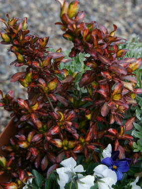 | コプロスマは矮性の種類、木立性の種類があります。葉の色が緑色、白斑、赤っぽい斑入りなど光沢のある美しい葉をしています。上の写真はコプロスマ・レペンスという種類で、春から秋は葉の色が黄色と緑の斑入りに、赤っぽい縁の色をしていますが、冬になり寒さに当たると葉の全体が紅葉のように赤っぽく変化します。耐寒温度が−5どぐらいあるので、暖地では庭植えが可能です。葉が美しい事から、寄せ植えのカラーリーフとしてもよく利用されています。育てるのは丈夫なので難しいことはないと思います。 | |