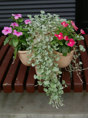 ディコンドラの育て方置き場所日当たりのよい所を好みます。蒸れを嫌うので、湿った日陰は避けます。ディコンドラの耐寒温度は0度ぐらいで、暖地では庭植えで越冬可能で、冬は葉の多くが枯れてしまう事がありますが、春になると芽が出てきます。寒地では戸外で越冬できないので、花壇のものは秋にポットなどに鉢上げして、室内で越冬させて春に植えつけるとよいと思います。水やり鉢植えでは生育期の春から秋まで鉢土の表面が乾けばあたえます。ディコンドラは多湿を嫌うので、水の与え過ぎには注意してください。花壇では特に与えなくても大丈夫ですが、あまり雨が降らないようなら与えます。冬は休眠気味になるので、やや乾燥気味の水やりにして越冬させます。植え替え鉢の底から根が出て根詰まり気味なら植え替えます。用土は多湿を嫌うので、観葉植物専用の土にパーライトを混ぜたり、赤玉土(小粒)6、腐葉土3、パーライト2などに植え替えます。時期は春の3月から4月頃、暖地では秋の9月下旬から10月上旬頃にも行えます。肥沃な用土を好むので、元肥としてマグァンプK(中粒)などを混ぜ込んで植え替えるとよいと思います。植え付け半耐寒性ですが、暖地では花壇に植えつける事ができます。多湿を嫌い肥沃な土を好むので、腐葉土と堆肥などを混ぜ込んで水はけをよくしてから植えつけます。場所は出来るだけ日当たりと風通しのよい所に植えつけます。肥料生育期の春から秋まで、緩効性の化成肥料や液体肥料などを与えます。元肥を混ぜて植え替えている場合は、元肥が切れるまで置き肥の必要はありません。その他は観葉植物の肥料のページを参考にしてください。増やし方(株分け)株が増えたら株分けして増やす事ができます。時期は植え替えと一緒に行います。 |