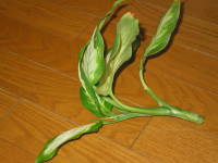 水やり年間を通して土鉢の表面が乾けば与えますが、梅雨時期から夏過ぎの生育期は乾く前に与えるようにして、水を切らさないように注意してください。また、霧吹きで葉に水を与えるともっと元気に育ちます。最低気温が20度以下になる秋からはだんだん水やり回数を減らして行きます。冬は鉢土の表面が乾いてから数日してからの水やりにして、冬は乾燥気味に管理します。冬に水を与え過ぎると枯れる原因になるので注意してください。その他、詳しくは観葉植物の水やりをご覧ください。植え替え2年に一度は植え替えをします。鉢一杯に根が回ると極端に生育が悪くなりますので注意してください。時期は5月〜8月中旬までに行ないます。用土は観葉植物専用の土に川砂やパーライトを2ぐらい混ぜるか、自分で作る場合は赤玉土(小粒6)、腐葉土2、パーライトや川砂2ぐらいの水はけのよい用土がよいと思います。時期は5月〜8月中旬までに行ないます。その他、詳しくは観葉植物の植え替えのページをご覧ください。整枝茎が伸びて樹形が乱れた株は思い切って整枝して樹形を整えます。茎の途中から新しく芽が出てくるので、しばらくすると樹形が蘇ります。時期は5月〜6月に行ないます。切り取った葉のついた茎は挿し木に利用できます。増やし方挿し木、水挿し挿し木や水挿しで簡単に増やす事が出来ます。葉のついた茎を水挿しすると一ヶ月ぐらいで発根するので、鉢上げします。時期は5月中旬〜7月です。下は温室内で育てていたディフェンバキアの茎が一部腐ったのか、原因がよく分かりませんが、倒れた茎を挿し穂に水の入った紙コップに入れて水挿ししたものです。1ヶ月もしたら発根して鉢上げできました。その他、詳しくは挿し木のページをご覧ください。