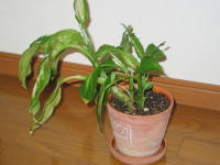 取り木下葉がなくなって見苦しくなったら、取り木をして仕立て直すことが出来ます。1ヶ月もしたら根が出てくるので切って植え付けます。親株の節からも新芽が出てきます。取り木の方法については、取り木のページをご覧ください。注意:樹液は毒性があり、手につくとかゆくなってしまう人がいます。かぶれ易い人はゴム手袋をつけて作業してください。また、口に入ると激しく腹痛をするそうなので、作業後は必ず手を洗ってください。 肥料生育期の春から秋まで、緩効性の化成肥料を置き肥して、定期的に液体肥料を与えます。その他は観葉植物の肥料のページをご覧下さい。冬の管理方法観葉植物の冬の管理をご覧下さい。 |