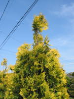 | 家の生垣に植え付けて育てています。四季を通して葉の色が変化してゆき、冬は黄金褐色、春は黄金色、夏は写真のように緑に変化してゆきます。ニオイヒバなので香りがあり、オレンジのようなよい香りがします。ヨーロッパゴールドは樹高があまり高くならないのも魅力で、四季を通じて葉の色の変化を楽しめるコニファーです。 |