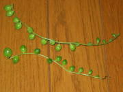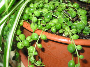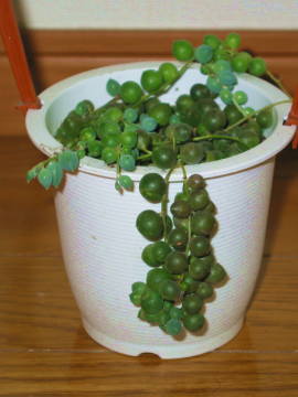 | グリーンネックレスは アフリカ南西部の乾燥した所に生息する蔓性植物で、地面を這って長さ1mぐらいに伸びるそうです。日本へは昭和40年頃に入って来たそうで、この姿が可愛らしいことから、昔から人気のある観葉植物です。1cmぐらいの丸い玉が数珠繋ぎにつきネックレスのようなのでこの名前になっています。別名に緑の鈴とも呼ばれています。乾燥した所に生息する多肉植物で丸い玉に水を蓄えて育ち、やや過湿に弱く水を与え過ぎると腐れてしまう事があります。しかし、多肉植物としては水を好む方なので極端な乾燥は嫌います。あまり強い日差しは好まず、木漏れ日の当たるような所を好み、日差しが強すぎると玉が小さくなり黄色っぽい色になります。葉を見る観葉植物ですが、冬の短日期に花を咲かせる事があります。 |