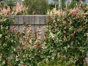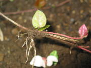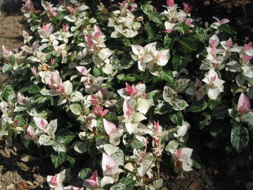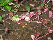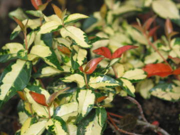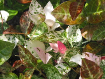 | ハツユキカズラの葉は、ピンク色の新芽と白い斑入りコントラストがとても綺麗な蔓性の低木です。耐寒性はマイナス5度ぐらいと強く、うちは九州で暖かいので防寒もせずに庭植えで育てています。挿し木でも比較的容易に増やす事ができ、庭植えでは蔓が地を這って自然と増えて行きます。春になるとまれに2cmぐらいの小さな花を咲かせ、近くによってみると甘くてよい香りがします。 写真の黄色っぽい葉をした種類は同じ仲間の黄金錦というものです。新芽が赤く、葉が黄金色でとても美しい色をしています。育て方は変わらないのですが、ハツユキカズラと比べると大きくなるスピードが遅く、挿し木もつき難いです。 |