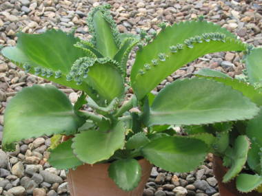 | 葉の縁に沢山の子が並んで付くので子宝草と呼ばれています。その子を土に乗せるだけで簡単に増やす事もできます。ベンケイソウの仲間なので花も咲き、沢山子が増えるので育てるのも楽しく、近所にお裾分けもできます。同じ仲間にセイロンベンケイソウと言う種類もあり、葉の色が濃い色をしていています。通常はこちらをマザーリーフと呼ぶのですが、両方とも子宝草、マザーリーフと呼ばれている事があります。同じ子だくさんの不死鳥という種類もあります。 | |||||||||||||||
