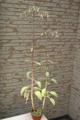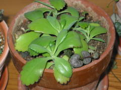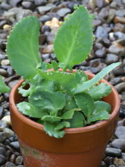 水やり表面が乾いたらたっぷりと与えます。秋の最低気温が20度を下回ってきたら、水やり回数を徐々に減らし、冬は表面が乾いて2、3日して乾燥気味な水やりにします。冬の水の与え過ぎは根腐れの原因になるので注意してください。その他、詳しく知りたい方は観葉植物の水やりをご覧ください。植え替え鉢の底から根が出て根詰まり気味なら植え替えをします。植え替え周期は2、3年に1度を目安に行います。時期は春の4月下旬から6月頃、秋の9月中旬から10月頃が理想的です。しかし、年をとると子が出来難くなるようなので、1年もしたら子から育てなおした方がよいと思います。用土は市販されている花や観葉植物の培養土でよいと思います。自分は赤玉土(小粒)6、腐葉土4ぐらいで植え替えています。多肉植物にしては水を好むので、根腐れの心配はあまりいりません。その他、詳しくは観葉植物の植え替えのページをご覧ください。増やし方葉に子が出来て根を伸ばし、自然に落下して根付く事が多いです。増やすのは子を取って普通の用土に乗せるだけでよいです。多肉植物なので、多肉植物用の土がよいのかと思い多肉植物の用土にも挿してみたのですが、土の方がよく育つ事がわかりました。結局、定植用の用土にのせて育てればよいようです。時期は春の4月下旬〜6月、秋の9月下旬〜10月頃に行うのが理想的です。写真は秋に子を挿して大きくした時のものです、その後は5月上旬頃に植え替え、6月には子がすでに付いています。それから3年目の2月に花を咲かせて枯れてしまいました。株が大きくなると姿が乱れてくるので、定期的に子を取って育てなおした方がよいです。