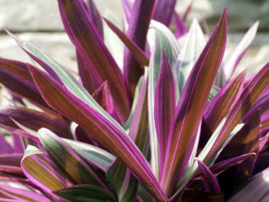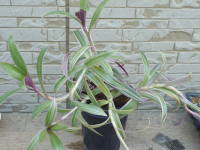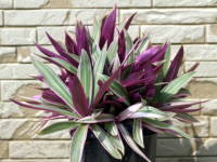 | ムラサキオモトは、葉の裏が紫色をしてオモトに似ていることから、ムラサキオモトという名前になったようです。オモトとは別の種類で、熱帯植物なので寒さには弱いです。種類は斑入りのバリエガタ(オーロラ)がよく出回っており、他に葉の黄色いイエロースターというのもあります。草丈が20cmから30cmぐらいで日当たりを好むので、同じ日当たりを好む植物との寄せ植えにも利用できます。夏にはツユクサ科らしい白い花が咲きます。 |