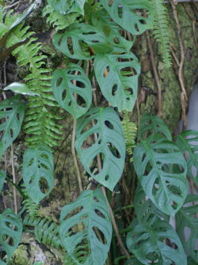 | マトカズラはコスタリカ原産の半蔓性の観葉植物で、写真は植物園の樹木に這っていたものです。モンステラの仲間で葉は薄く長さ20cmぐらいと小型で、葉に穴が不規則にあいたユニークな姿をしています。蔓をヘゴ仕立てなどにして売られている事があり、寒さにはやや弱いです。 |