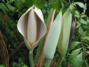 | モンステラは熱帯アメリカの25種類ほどが生息しています。葉の長さが1m以上と大きなデリシオサ、葉が20cmほどのヒメモンステラ、白い斑が入ったものがあり、他に葉に切れ込ものないマドカズラやハネカズラなどもあります。名前はラテン語で「怪物」を意味する言葉だそうで、とても葉の大きいデリシオサを見た人が名付けたのかもしれません。植物園に大きなものが植えられていて、大きな花が咲いているのを見かける事があります。花が熟すと実は果物として食べる事ができるそで、沖縄の方では10月頃に売られているそうです。葉に切れ込みのあるユニークな姿をした人気のある観葉植物で、耐陰性があり寒さにも比較的強く育てやすいです。 |