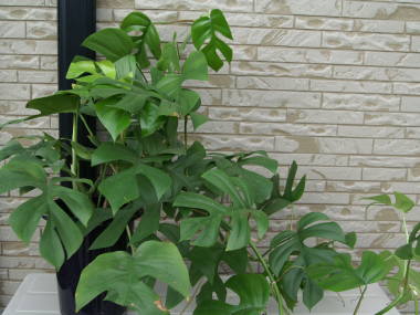 モンステラの育て方置き場所強い日差しを嫌うので、年間を通じて明るい日陰で育てるとよいです。耐陰性は強いですが、あまり暗いと貧弱に育つので、出来るだけ明るい所で育てます。冬の寒さには強くないので、秋の最低温度が15度を下回ったら、戸外にあるものは室内へ入れ、冬は最低温度5度以上の明るい所から日当たりのよい所で育てます。その他は観葉植物の置き場所をご覧下さい。