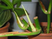増やし方挿し木葉の付いた2、3節ぐらいの挿し穂を用意します。上の葉を1枚だけ残して残りの葉は取り除きます。長過ぎる邪魔な気根があれば適度な長さに切って、下の1、2節ぐらいが土に埋まるように挿します。葉が大きいので、半分ぐらいの面積になるように切った方が葉からの蒸散が減って着きやすくなります。時期は5月から7月頃に行うのが理想的です。容易に増えるので、切り戻した場合はためしにやってみるのも面白いと思います。写真は10月と時期が遅かったので、温室の中で温度設定20度にして管理しました。その他は挿し木のページを参考にしてください。