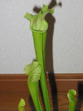 サラセニアは北アメリカの湿地帯に生息する食虫植物です。筒状になった捕虫葉の中の蜜線という甘い香りを発するものがあり、それに誘われた昆虫が中に滑って落ち、登ろうとしても下向きに生えた毛で上る事が出来ず、中の消化液で溶かされて栄養分にしています。種類は高性で写真のドラモンディーのような長い筒をしたタイプや匍匐性で横に広がって増えるタイプもあります。5月の新芽が伸びる前に花を咲かせ、種類によって白、桃、赤などがあり、一つの花の寿命は1週間ぐらいあるので切り花にする事もできます。また葉の模様がとても美しい高性のものは切り葉の素材に利用される事があります。温暖で空中湿度のある痩せ地で育ち、寒さにはさほと強くはありませんが、冬は凍らない程度の気温で地上部の葉が枯れたようになって休眠します。