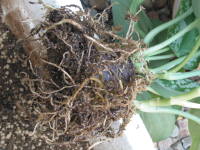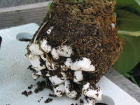 水やり鉢土の表面が白く乾いたら水を与えます。比較的乾燥には強いですが、初夏から夏はよく水を吸うので乾く前に与えます。秋の最低気温が20度以下になったら徐々に水を吸わなくなってくるので、それに合わせて水やり間隔もあけていきます。冬は鉢土の表面が白く乾いてから数日してからの水やりにして乾燥気味に管理します。乾燥には比較的強く、冬に水を与え過ぎると根腐れする事があるので注意してください。湿度の高い所を好むので、霧吹きで葉に加湿しながら育てるとよいです。空中湿度が高いビニール温室などでは、茎の途中から長く根を伸ばす事もあります。その他、詳しくは観葉植物の水やりをご覧ください。植え替え2年以上植え替えていなかったり、鉢の底から根が出て根詰まり気味なら植え替えをします。時期は高温多湿帯の熱帯観葉植物ですので6月から7月中旬頃の梅雨時期が理想的です。用土は水苔や市販されている観葉植物専用の土がよいと思います。自分は赤玉土(小粒)5、腐葉土4、ピートモス1ぐらいで植え替えています。下の写真は購入後に葉の色が悪くなったので鉢から抜いてみると、用土と水苔が混じって植えられて根腐れ気味だったので、水苔を取り除いて用土だけに植え替えた時の写真です。その他、植え替えについては観葉植物の植え替えのページをご覧ください。