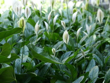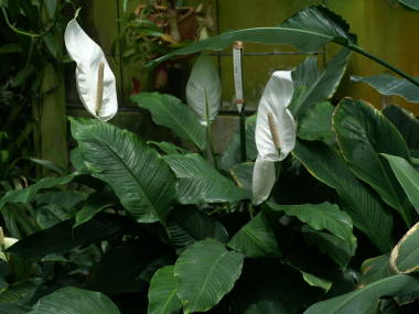 | 左上の写真は今育てているスパティフィラムです。純白の花が美しく、光沢の葉がふさふさと茂り、白い花と濃い緑色の葉とのコントラストがとても魅力的な観葉植物です。白い花に見えるのは実際は花ではなく仏炎苞というものです。花は右上の写真で花序と書いているのが花になります。種類は35種ほどがあり、大型のキャニフォリウム、中型のマウナ・ロア、小型のミニ・メリーなど、最近は斑入りのスパティフィラムもあります。 | |||||||||||||||||||||