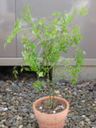 | ステレオスペルマムは葉が小さく光沢のある美しい色をした、とても魅力的な観葉植物です。枝に小さく茂った沢山の葉も、夏を涼しく感じさせてくれます。上の写真のは冬に半落葉して、無事に冬を越えたのですが、樹形が乱れたので5月頃に切り戻したら葉が出てこないまま枯れてしまいました。 | |||||||||||
