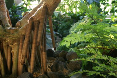 | タコノキは写真のように木根がタコの足のようなので、タコノキと呼ばれています。タコの木は100種類以上あり、一番美しいと言われるのが写真のビヨウタコノキです。他に葉に縞のあるシマタコノキ、小笠原のオガサワラタコノキ、沖縄のアダンなどもあります。写真は植物園にあった高さが5m以上はあろうかと言うビヨウタコノキです。葉の生え方も綺麗ですが、気根が大変魅力的なタコノキです。 | |||||||||