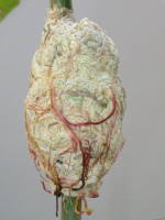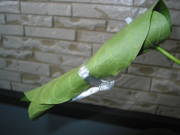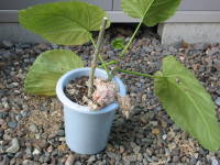 発根と植え付け 40日もすると発根するので水苔を取り除きますが、全て取ろうと無理すると根を切るといけないので簡単でよいです。大まかに取り除いたら根の下の部分を切り取って鉢に植え付けます。まだ根が少く水を多く吸えないので、急に直射日光に当てず明るい所に置き、葉が萎れてしまう場合は葉の数を減らしたり丸めるとよいです。1週間ぐらいしたら緩効性の肥料を置き肥して、徐々に日光に慣らせます。 約1ヶ月半もすると元株からも新芽が出ています。