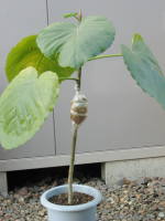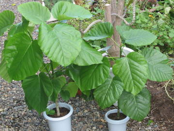 | フィカス・ウンベラータは熱帯アフリカ原産の常緑樹です。葉の形はハート型をしてとても大きく、長さ30cmぐらい、幅が20cmぐらいになり、葉が増えるとボリュームのある姿になります。部屋のインテリアなど人気のある観葉植物で、大きく育てると背丈を超えるぐいになります。寒さには強くないので、冬に葉が落ちてしまう事が多いですが、芽吹きがよいので春になると新しい葉が伸びてきます。また、切り戻して樹高を抑える事も容易で比較的育てやすいです。 |