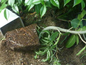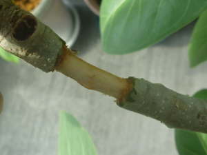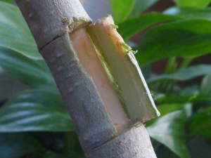 取り木枝の皮に切れ込みを入れ、そこを濡らしたミズゴケで覆うと水分を求めて根が出てきます。比較的太い枝でも行えるので、すぐに大きな苗を作る事ができます。伸びすぎてしまった枝や下葉が少なくなって見苦しくなった枝を利用して増やしてもよいし、大きくなりすぎて置き場所に困ってしまった場合も、取り木から作り直すという方法があります。@皮の取り除き根を出させて切り取りたい所に、2cm幅ぐらいの上下にカッターナイフなどで茎の周りに切れ込みを入れ、縦にも入れてそこからはがすようにします。切り込みを入れるのと皮をはがすのは、中心の白い部分が固く皮は柔らかいので慣れれば難しくはないです。
