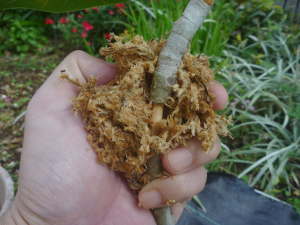 Aミズゴケとビニールで覆う濡らしたミズゴケを絞って、皮をはいだ所に巻きます。水分が蒸発しないようビニールで覆ってヒモやビニタイなどを使って巻きつけ、後で水やりする時のためにほどけやすくしておくとよいです。