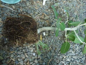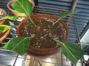 Bその後の管理その後はミズゴケが少し乾燥してしまう事があるので、2週間に1回ぐらいビニールの上側だけを外し、霧吹きなどでミズゴケを濡らしてあげるとよいです。置き場所は通常の所でかまいません。C鉢上げ2ヵ月もするとミズゴケから根が見えるようになるので切り取ります。ミズゴケは無理に取ると根を切るので、土となじむよう濡らして軽く表面を取り除くぐらいにして植えつけます。新芽が出るまで明るい所に置いて、徐々に直射日光に慣らせるようにします。D翌年の切り戻し枝の数を増やしたい場合は先端を切り戻すとよいです。時期は今シーズン行うと冬までの生育期間が短く枝が伸び難いので、翌年の春に行ったほうが良いと思います。切り戻し、剪定もし枝が高く伸びすぎてしまったら、好みの高さになるように切り戻すと、切った付近から新しい枝が伸びてきます。また冬に葉を落としてスカスカになったり、四方八方に枝が伸びて樹形が乱れたら、将来の樹形を考えて剪定するとよいです。時期は遅くならないよう4月中旬から5月頃までに行うと早く葉を茂ります。冬の管理方法寒さには強くないので、室内の5度以下にならない明るい窓辺などに置いておくとよいです。寒さで成長が止まり水の吸い上げは緩やかで、肥料は全く必要としなくなります。水やりは控えめに、いつも湿った状態だと根腐れすることがあるので注意してください。冬は空気が乾燥するので、暖かい時間帯に霧吹きで葉水を与えると葉が傷むのを抑える効果があります。その他は観葉植物の冬の管理をご覧下さい。冬を超えた春の状態冬はあまり葉を落とさずに越冬するので、葉が多く落ちてしまった場合は、根詰まりや根腐しているかもしれません。5月から6月頃に植え替えをして必要なら剪定を行うとよいです。害虫の発生など発生はほとんどないと思いますが、アブラムシやハダニが発生することがあるそうです。もし発生してしまったら各害虫に適した殺虫剤を散布しておきます。 |