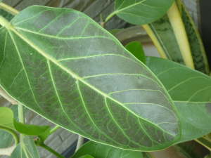 肥料生育期の春から秋まで緩効性の化成肥料などを置き肥したり、定期的に液体肥料を与えるとよいです。冬は生育が止まり必要としないので与えないようにします。その他は観葉植物の肥料のページを参考にしてください。増やし方挿し木挿し木で増やすことができます。時期は5月から8月頃まで行えます。挿し穂は2、3節分、長すぎるものは1節でもよいです。葉を1枚残してそれ以外にある節の葉は取り除きます。葉が大きく水分の蒸散が多いので面積を半分ぐらいにハサミで切ります。切り口から白い樹液が出るので水の中に止まるまで入れ、葉の表が上になるよう切り口が軽く出るぐらいに用土に挿します。明るい日陰に置いて土が乾かないようにしておくと2ヵ月で発根します。普通の用土に鉢上げして、徐々に直射日光に慣らるようにします。その他は挿し木のページを参考にしてください。