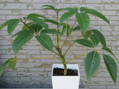 水やり春や秋は表面が白く乾いたら与えます。真夏は乾かし過ぎないよう乾いてきたら与えますが、日陰で乾き難い所では過湿で根腐れする事があるので乾いてから与えます。秋が深まってくると土の乾きが遅くなるので、水やりの間隔も徐々にあいてきます。初冬になると生育を止めて休眠するので、鉢土の表面が白く乾いて更に3,4日ぐらいして与えるぐらいとかなり控えめでよいです。冬は春から秋の生育している時期のように水を与えると根腐れしやすいので注意してください。空中湿度を好むので、年間を通じで霧吹きで葉に水を掛けてあげると葉の痛みが少なくて良いです。しかし、冬は暖房や昼間の暖かい時にぬるま湯にして掛けてあげるとよいです。その他は観葉植物の水やりを参考にしてください。植え替え鉢底から根が出て根詰まりしていたり、2年以上は行っていないものは植え替えます。時期は5月から6月頃に行うのが理想的ですが、夏の8月一杯まで行う事ができます。夏に行う場合は植え替え後はしばらく日陰において、直射日光には当てないように注意してください。用土は観葉植物の培養土を利用すればよいですが、自分で作る場合は赤玉土(小粒)7、腐葉土3など普通の用土でかまいません。鉢から根鉢を引き抜いたら、周りの土を棒などを使って3分の1ぐらい取り除きます。伸びすぎた根や腐ったものは短く切って、樹形に合わせて一回りから二回りぐらい大きな鉢に植えます。その他は観葉植物の植え替えのページを参考にしてください。肥料春の5月から10月上旬頃まで定期的に緩効性の化成肥料を置き肥したり、定期的に液体肥料を与えてもよいです。冬は寒さで生育せず必要としないので、与えないようにします。冬に与えると根が腐る事もあるので注意してください。その他は観葉植物の肥料のページをご覧下さい。仕立て直し冬に下葉を落として樹形が乱れてしまう事があります。好みの高さで切り戻しを行うと、切った付近の節から枝が伸びてきます。また伸び過ぎた枝は適度な長さに切るとよいです。時期は4月中旬から5月頃までにやってしまうと夏頃には葉が伸びてきます。切った枝は挿し木に利用する事が出来ます。増やし方挿し木や茎伏せ挿し木は葉の付いた長さ2、3節分の挿し穂を用意して、一番下の節の葉を取ってその節が用土に埋まるように挿します。葉が大きいのでハサミで大きさが3分の1ぐらいになるようにカットするとよいです。また、葉のない長さ2,3節分の茎を平鉢などに埋める茎伏せを行って増やす事もできます。時期は5月から8月頃まで行えます。その他は挿し木のページを参考にしてください 。取り木伸び過ぎてしまって切り戻したい場合、取り木をすると早くもう1本増やす事ができます。切り戻したい所に根が出るよう切り込みを入れ、ミズゴケを巻いておくと根が出てきます。根が出たらその部分を切って土に植え付けるだけです。方法は取り木のページを参考にしてください。 |