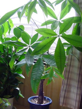 | パキラ属は20種ほどがあり、観葉植物として出回っているのはグラブラ種(Pachira glabra)とアクアティカ種(achira aquatica)があるようです。見分け方は分かりませんが、アクアティカ種は水辺で育つパキラで、カイエンナッツという別名があり、以前は食用ナッツとして食べられていましたが、有毒な成分が含まれている事が分かり、今は食べられていません。グラブラ種の実は以前から食用にされておらず、最近出回っているパキラはグラブラ種の方のではないかという説があり、自分もそうではないかと思います。写真は2000年頃に購入したもので、乾燥に比較的強く、丈夫で育てやすいので今も元気に育っています。生育がよいので伸びるのが早く、2年周期で切り戻しをしていますが、樹形の大きさをコントロールするのが容易であまり根も張らないので、大きくせずに長く育て続ける事ができます。昔から人気の高い観葉植物で、手を広げたような葉と樹形がとても魅力です。 |