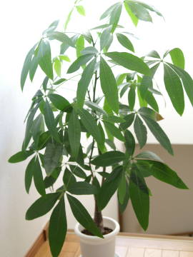 パキラの育て方置き場所日当たりを好むので、日当たりのよい所でよく育ちます。しかし、夏の日差しは強すぎるので、強い日差しは避けて育てます。耐陰性があるので日陰でも育ちますが、日照が不足すると節と節の間が開いて間延びしやすいので、窓辺などのできるだけ明るい所で育てます。熱帯の植物で冬の耐寒性がないので、戸外に出しているものは秋の最低気温が15度を下回ったら、室内へ取り入れます。冬は最低温度5℃以上で、明るくできるだけ暖房の効いた暖かい室内で育てます。その他は観葉植物の置き場所をご覧下さい。
