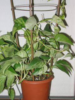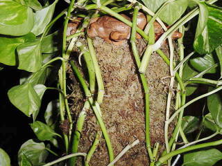 写真は垂木に水苔を巻いたヘゴ仕立てモドキのポトスです。14号鉢の中心に高さ170cmぐらいの垂木を立て周りに水苔を巻いて釣り糸で固定しました。乾燥しないよう頂上には水が徐々に出てくる陶器製のウォーターキーパーと穴を開けた空き缶を水苔に潜らせ、中に水や液肥を入れて水苔を湿らせていました。始めは蔓が少なく寂しかったので、挿し芽したものを土に植えたり、摘心して蔓を増やしていました。湿らせた水ゴケの中に気根が入り込んでゆき、養分をよく吸えたようで3年程で葉が25cmぐらいある大きなポトスになりました。その後は重みで傾むいてしまい解体しましたが、根が水苔の中を通って2mぐらいの長さになっていました。