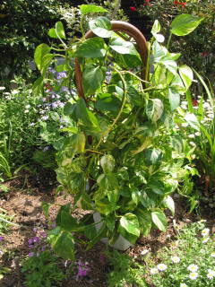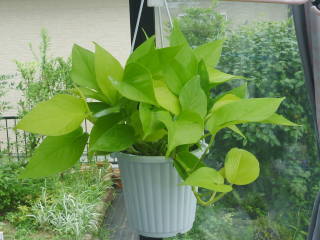 吊り鉢に植えつけて、蔓を下に垂らせて観賞して楽しみます。トイレなどの置き場所の狭い所にも便利です。5号鉢で4、5本ぐらい、鉢周りの葉が少し寂しい場合は、鉢の中に蔓を1周ぐらいさせると葉が多く茂った感じになります。吊るので用土は軽い方がよいので、ピートモス6、バーミキュライト2、パーライト2などを利用するとよいです。