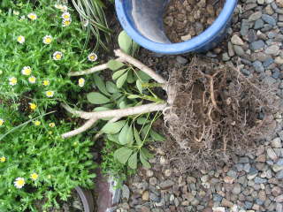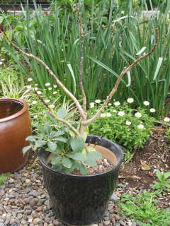 植え替え根の張るスピードが早いので2年すると鉢底から根が出て根詰まりする事も珍しくないです。根が詰まると生育が悪く、夏に水切れしやすくなったり、冬になると葉が沢山落ちる事もあります。時期は春の4月下旬から6月頃に行うのが理想的ですが、9月上旬頃まで行えます。用土は市販されている観葉植物の培養土、自分で作る場合は赤玉土(小粒)6、腐葉土4など、標準的な自分好みの配合でよいです。伸びすぎた根は短く切り、根鉢の周りを軽く壊して一回り大きな鉢に植え替えます。もし鉢を大きくしたくない場合は、根鉢の周りの土を多めに取り除いて植え替えるとよいです。写真は冬に枝が傷んだものを切り戻して植え替えました。その他の基本的な事は植え替えのページを参考にしてください。