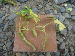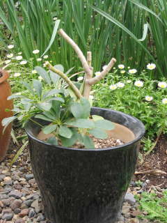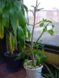 取り木下葉がなくなって見苦しく感じたり、樹形が大きくなり過ぎたら取り木をする事が出来ます。挿し木よりも早く樹形を大きく出来るのがメリットです。2ヶ月もしたら根が出てくるので切って植え付けます。親株の切った付近からも新芽が出てきます。その他は取り木のページを参考にしてください。 |