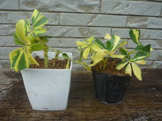 暖地では戸外で越冬可冬に凍らないぐらいの暖かさのある暖地では、霜が当たらない軒下で越冬が可能です。暖地でも氷点下の日か何日が続くと、枝が部分的に枯れる事があるので、大きくて部屋に入らないなど仕方のないものを除けば、できるだけ室内で越冬させた方が無難です。冬を越えたシェフレラうまく冬を超えると多少葉が落ちるぐらいです。もし、葉が多く落ちてしまった場合は、水の与えすぎによる根腐れや根詰まりをしている事があります。多少の根腐れでも全体が枯れる事は少ないので、4月下旬頃になったら剪定を兼ねて、腐った根を取り除いて新しい土で植え替えるとよいです。年間を通じて霧吹きを湿度の高い所を好むので、年間を通じて霧吹きで葉水を与えると葉の痛みが少ないです。冬は室温ぐらいに温めた水を利用した方がストレスを与えなくてよいと言われています。春から秋の暖かい時期は、たまに戸外で全体にシャワーをかけると、葉に着いたホコリなどが取れて葉色も美しくなります。増やし方挿し木挿し木で容易に増やす事ができます。長さ10cmぐらいの挿し穂を用意して、先の葉を2枚ぐらい残して他は取り除きます。葉の面積が広いのでハサミで半分ぐらいに切ると挿し穂が弱り難くなります。小鉢に赤玉土(小粒)7、ピートモス3などの土を入れ、葉の取った節が土に埋まるように挿します。葉の重みや風で倒れそうな場合は、細い支柱や割り箸などを立ててヒモやビニタイで固定しておきます。時期は5月から8月頃まで、明るい日陰に置いて水やりします。うまくいくと2ヵ月ぐらいで定植できるので、5号鉢に2株を目安に植え付けます。定植時期が9月を過ぎてしまった場合は翌年の春に植えます。